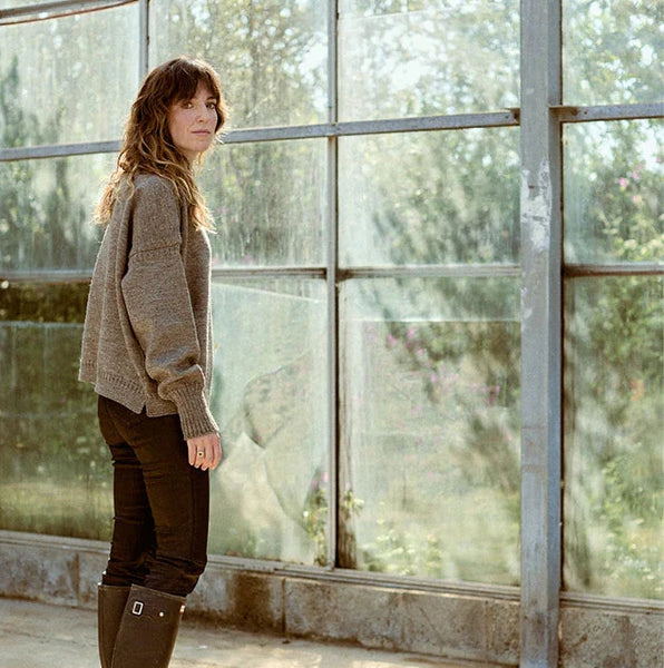 This colourway is made from undyed wool a has a natural mushroom hue. This style has the look of a traditional guernsey but sits shorter and wider in the body for those that like a roomier knit. The dropped shoulder gives a bit more of a slouchy feel which is more comfortable than the body hugging traditional guernsey.